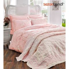1 adet nevresim,1 adet çarşaf,4 adet yastık kılıfı, 1 adet yatak örtüsü. 250x240 cm, yastık kılıfı : Taç lorinda pikeli çift kişilik nevresim takımı pembe.